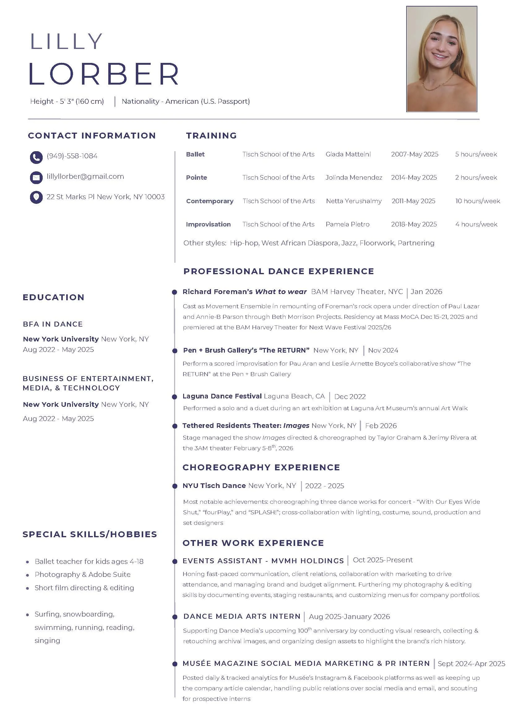 My interdisciplinary work within dance and media seeks to disrupt the traditional passive intake of art and call audiences to be active proponents who are integral to the performance. I am interested in fleshing out and distilling common themes of human nature in dance, photography, and film; such as the individual’s place in the collective and constant redefinition of what it really means to touch, to see, to connect with other humans in these art forms. Finding merit in the smallest, repetitive motions while also pushing to the fullest, unapologetic abandon of the body is the continuum my movement lives on. Above all, I believe allowing dance, photography, and film to be never ending, open conversations with plenty of space for laughter and humor.